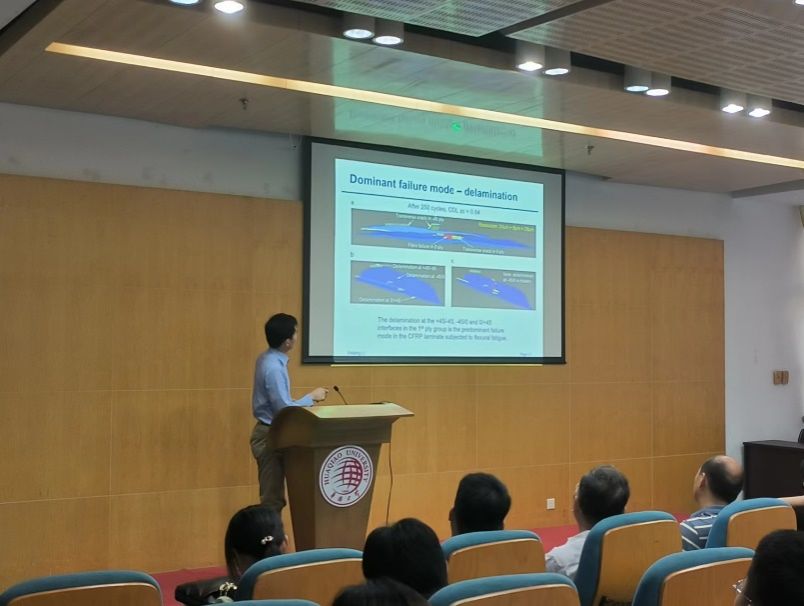 首先,林添良副经理简单介绍了李培锋副教授的科研情况及本次讲座的主题,随后李培锋副教授从CFRP复合材料的制作方法、静力学性能实验以及动力学性能三个方面做了非常详细的报告。其中着重介绍了CFRP材料的力学性能实验、材料产生裂纹的机理、表层区域的裂纹计算机模拟计算、以及对表层拉应力区和压应力区的应力对比。