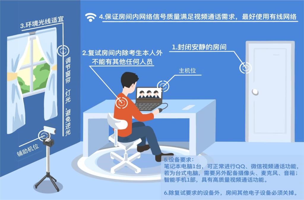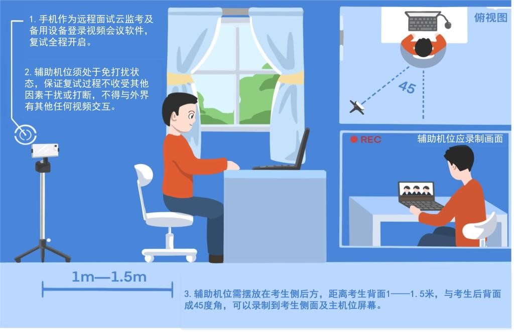 考生需要使用“双机位”模式参加复试,即需要准备2台带摄像功能的设备,电脑+手机或笔记本+手机或手机+手机1台用于面试设备(主机位,建议使用内置摄像头和麦克风的笔记本电脑或带声卡的台式电脑外接摄像头和音箱),放置在考生座位正前方,视频监控范围应保证考生在坐姿状态下,能够完整清晰覆盖头部到桌面位置;1台用于监控面试环境的手机(辅助机位,确保视频功能正常,画面清晰),放置于考生斜后方45°位置,确保监控范围覆盖第一台设备的显示屏幕和考生本人头部、背部、手部。主机位要求有线网络或可保证网络质量的无线网络连接,辅助机位需采用4G网络连接(保证流量充足)。
