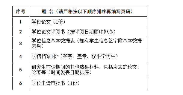 博士学位论文5份(其中研究生院提交3份,将已编码的1份放入档案袋),硕士学位论文3份(其中研究生院提交1份,将已编码的1份放入档案袋).博硕士学位审批书2份(为方便审核,已编页码的1份审批书暂不放入档案袋)。