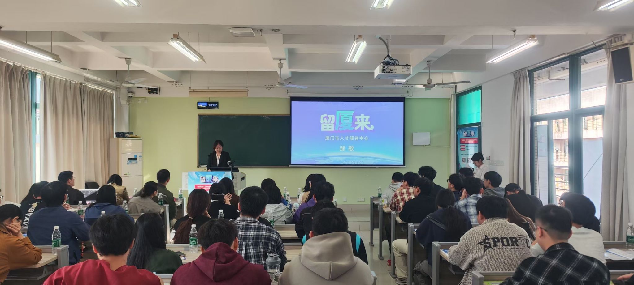 活动伊始,厦门市人才服务中心邹敏部长围绕厦门城市发展优势、产业布局特点及引才政策展开宣讲,详细解读了住房补贴、就业扶持、落户便利等青年关注的核心福利。同时推荐了线上就业服务渠道,方便同学们查询岗位信息、了解政策详情及投递简历。
