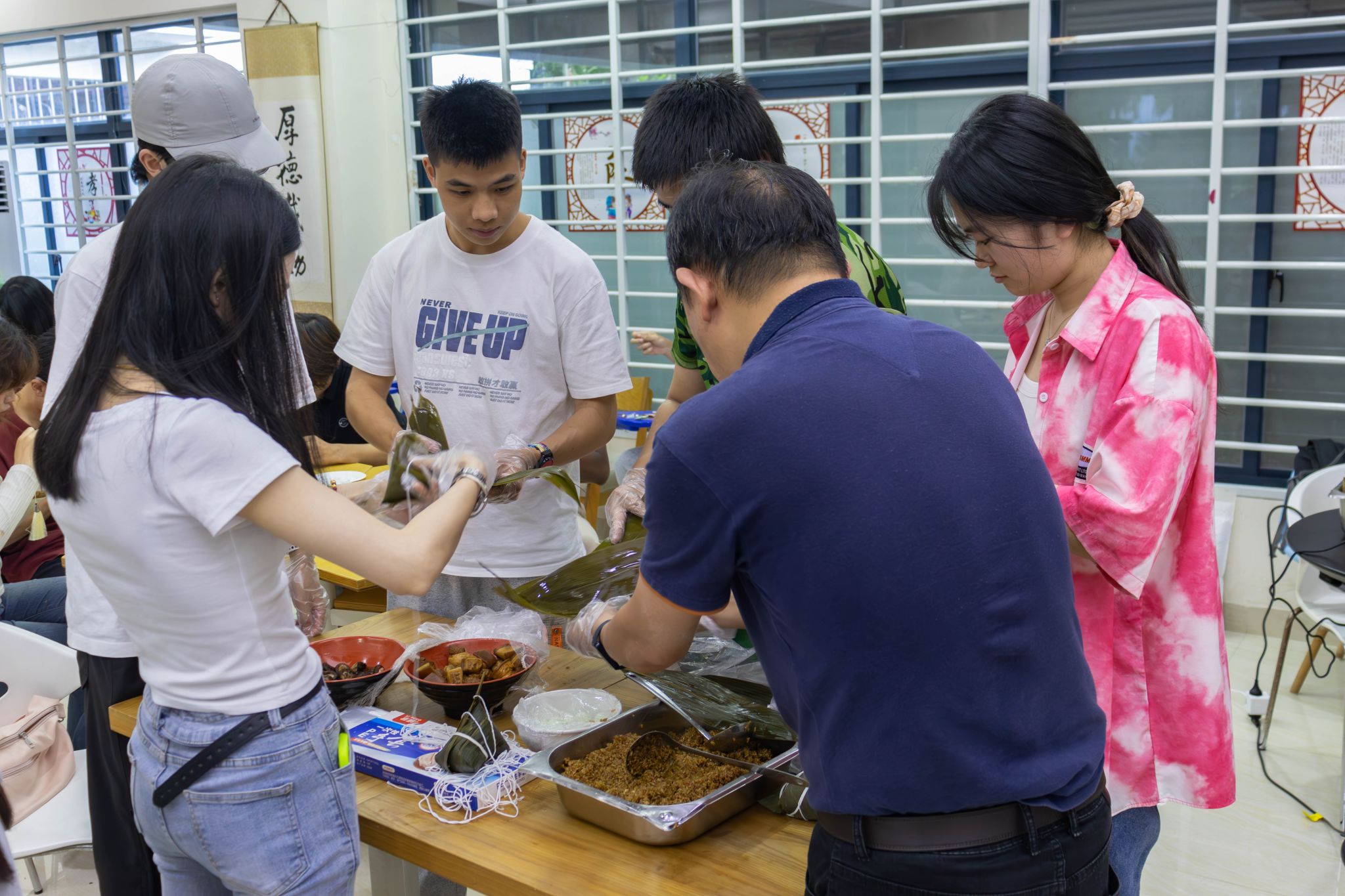 在本次活动中,主持人向参与师生介绍了端午节的由来相关习俗以及象征意义,在视频教学和老师指导下学习制作端午节传统特色香囊,食堂工作人员为同学们演示制作粽子的方法,在学习之后,同学们亲身参与体验制作香囊和粽子的过程,公司的老师们也参与其中来帮助同学们一同制作,现场活动氛围融洽,同时培养同学们的动手能力,也展现境内外师生互帮互助的热情。