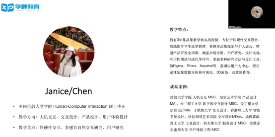 陈怡祯老分享了英国院校人机交互专业的一些情况,对其课程设置、学习内容、毕业形式等进行解读。围绕申请留学的作品集规划,对同学们提供了专业学习、职业发展规划上的建议。最后她为同学们推荐了一些知名留学院校并分享了部分成功的员工案例,供大家进行学习参考。