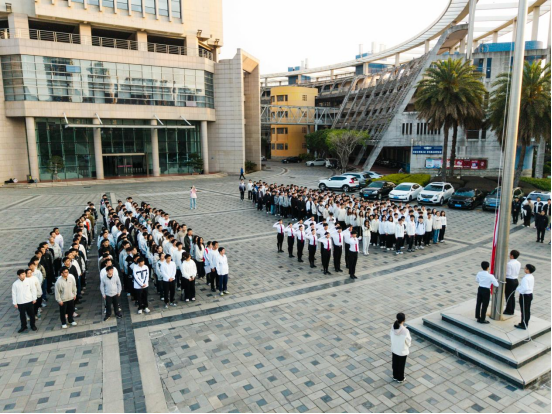 伴随着初升的太阳,国旗护卫队迈着整齐划一的步伐,喊着铿锵有力的口号,护卫着五星红旗走向升旗台。伴随着冉冉升起的五星红旗,全场师生共同唱响《义勇军进行曲》。