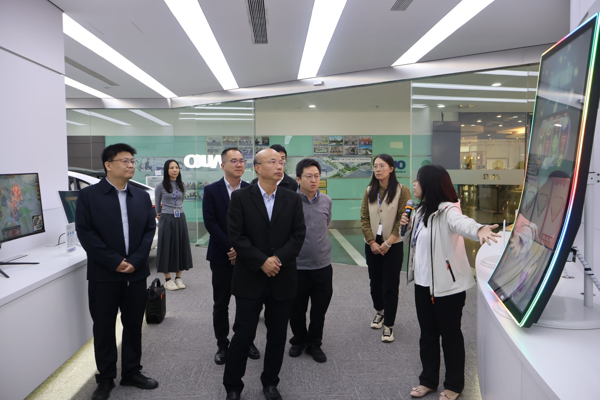 在总经理特别助理林俊杰,人力资源处处长郑圆圆,先进制造部副理杨凯,S19厂工程部副理、公司07届员工陈奕红以及招募任用部副理王璐璐、段蓉等企业负责人的陪同下,学院领导老师一行参观了公司展厅,深入了解了企业发展历程、产品体系与技术优势,近距离感受了光电行业的前沿科技与智能制造场景。