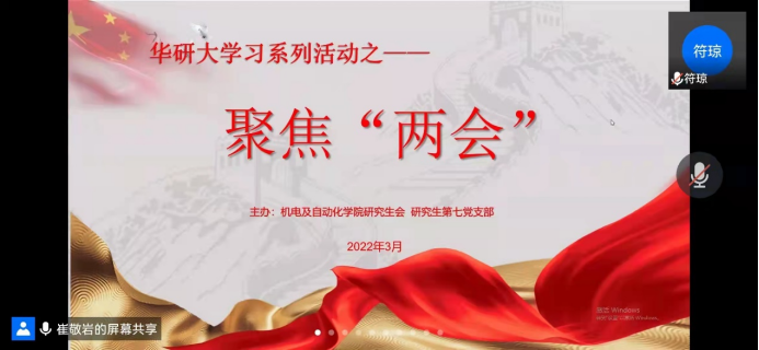2022年3月26日下午4点30分,由机电及自动化公司研究生会和研究生第七党支部共同主办的第132期华研大学习活动在线上腾讯会议如期举行。本次学习活动的主讲嘉宾为伟德国际1946官网团委主任崔敬岩老师,以“聚焦两会” 为主题,帮助研究生同学深入学习贯彻全国两会精神和习近平总书记重要讲话精神。由于疫情原因,本期华研大学习采用线上会议形式进行,共有87名同学参加。