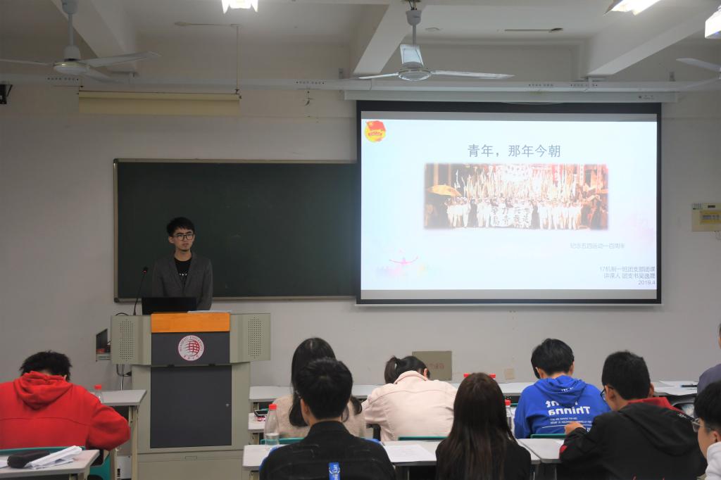 夏小丁同学的团课则从五四精神历史起源、基本概述、时代内涵和纪念五四精神四个方面来加深同学们对五四精神的认识,呼吁青年在习总书记的号召下,认真学习五四精神的重要意义,追寻辈的足迹,勇做走在时代前列的奋进者、开拓者、奉献者。
