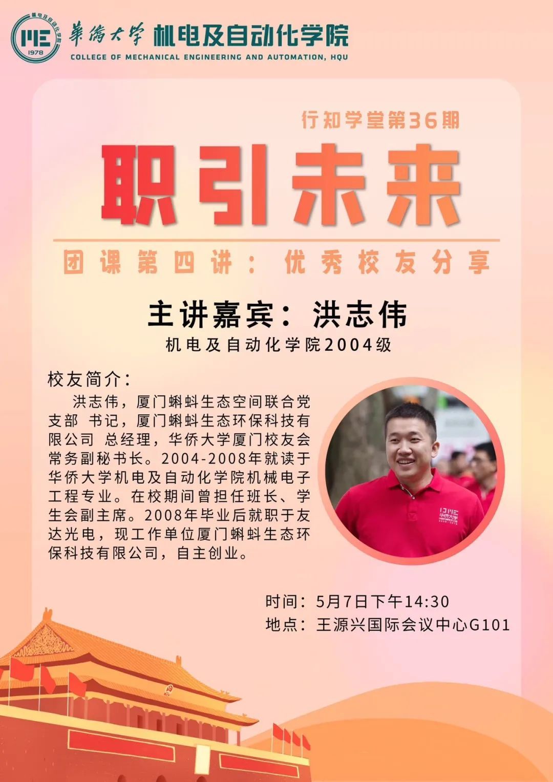 洪志伟学长以“我的大学与大学后”为主题,以“上学”、“毕业”、“工作”、“创业”四个时间段,向同学们分享了他的老员工活、毕业时做出的选择及工作后选择创业的机遇等人生故事。洪志伟学长基于自己的人生阅历与工作经历,给同学们提出要在学校多交朋友多锻炼,积极参与员工工作等希望,给同学们提出了几点实用的职场建议。