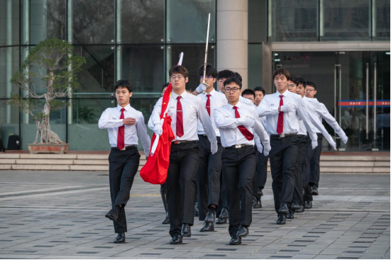 伴随着初升的太阳,国旗护卫队迈着整齐划一的步伐,喊着铿锵有力的口号,护卫着五星红旗走向升旗台。伴随着冉冉升起的五星红旗,全场师生共同唱响《义勇军进行曲》。
