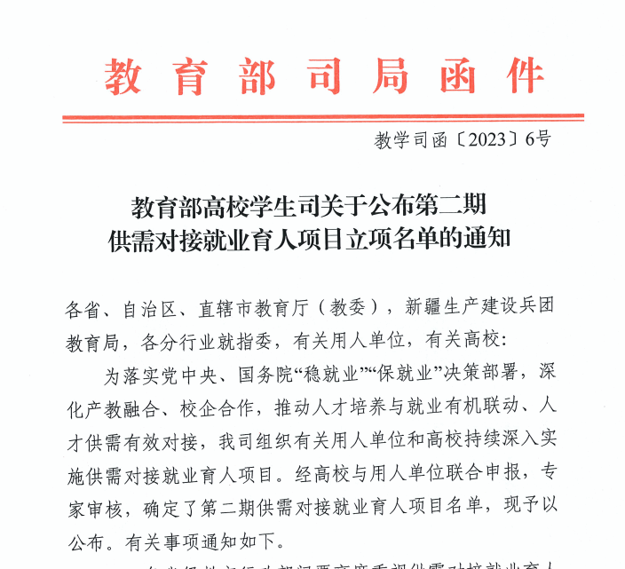 为落实党中央、国务院“稳就业”“保就业” 部署,深化产教融合、校企合作,推动人才培养与就业有机联动、人才供需有效对接。4月6日,教育部高校员工司下发了《关于公布第二期供需对接就业育人项目立项名单的通知》,公司与浙江吉利控股集团有限公司、宁德时代新能源科技股份有限公司联合申报的两个就业实习基地项目成功入选教育部第二批供需对接就业育人项目。