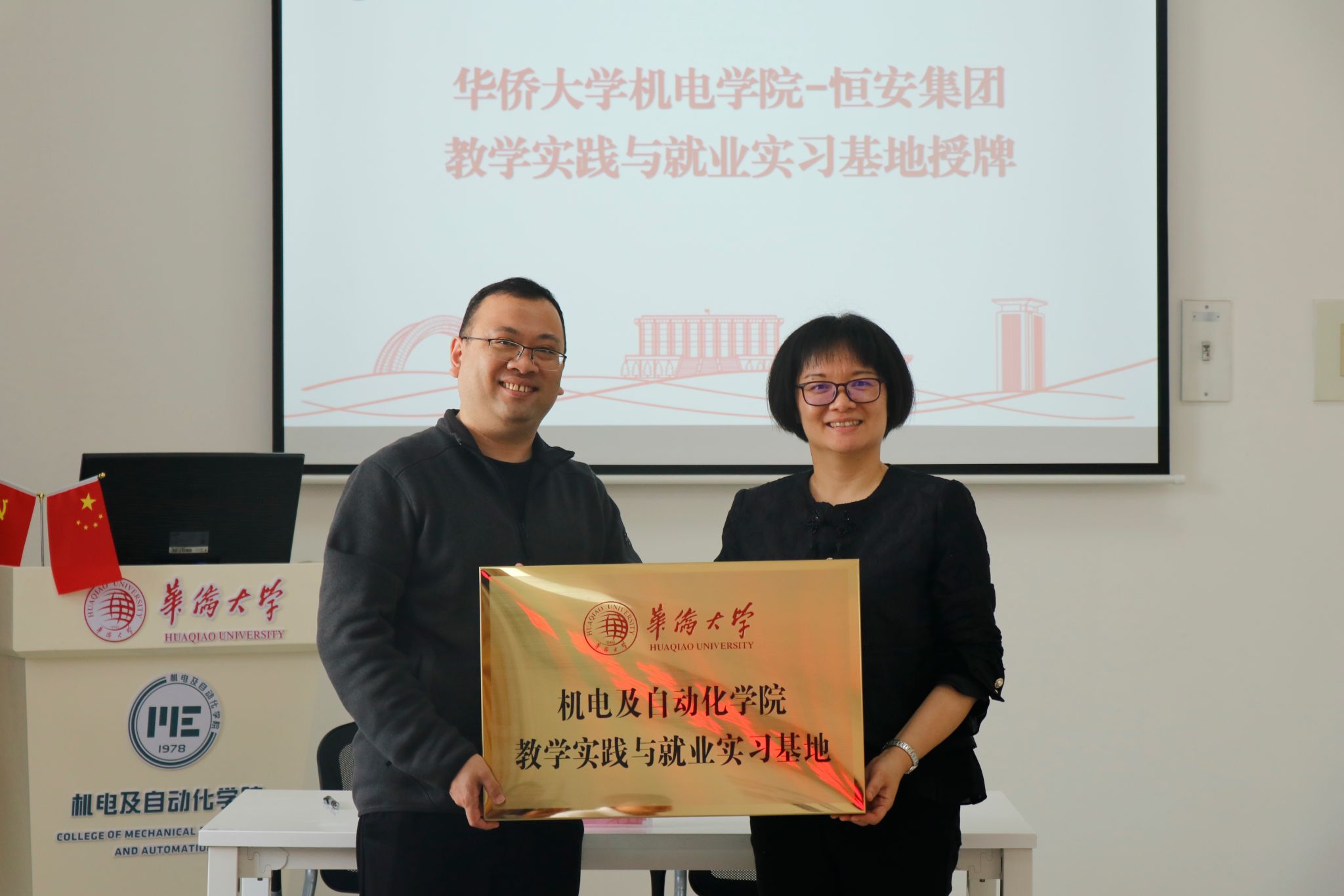 伟德国际1946官网副经理李远和恒安集团人力资源总监杨成龙代表双方签署了合作协议。党委书记黄宁代表学院向恒安集团颁授了“共建教学实践与就业实习基地”牌匾。