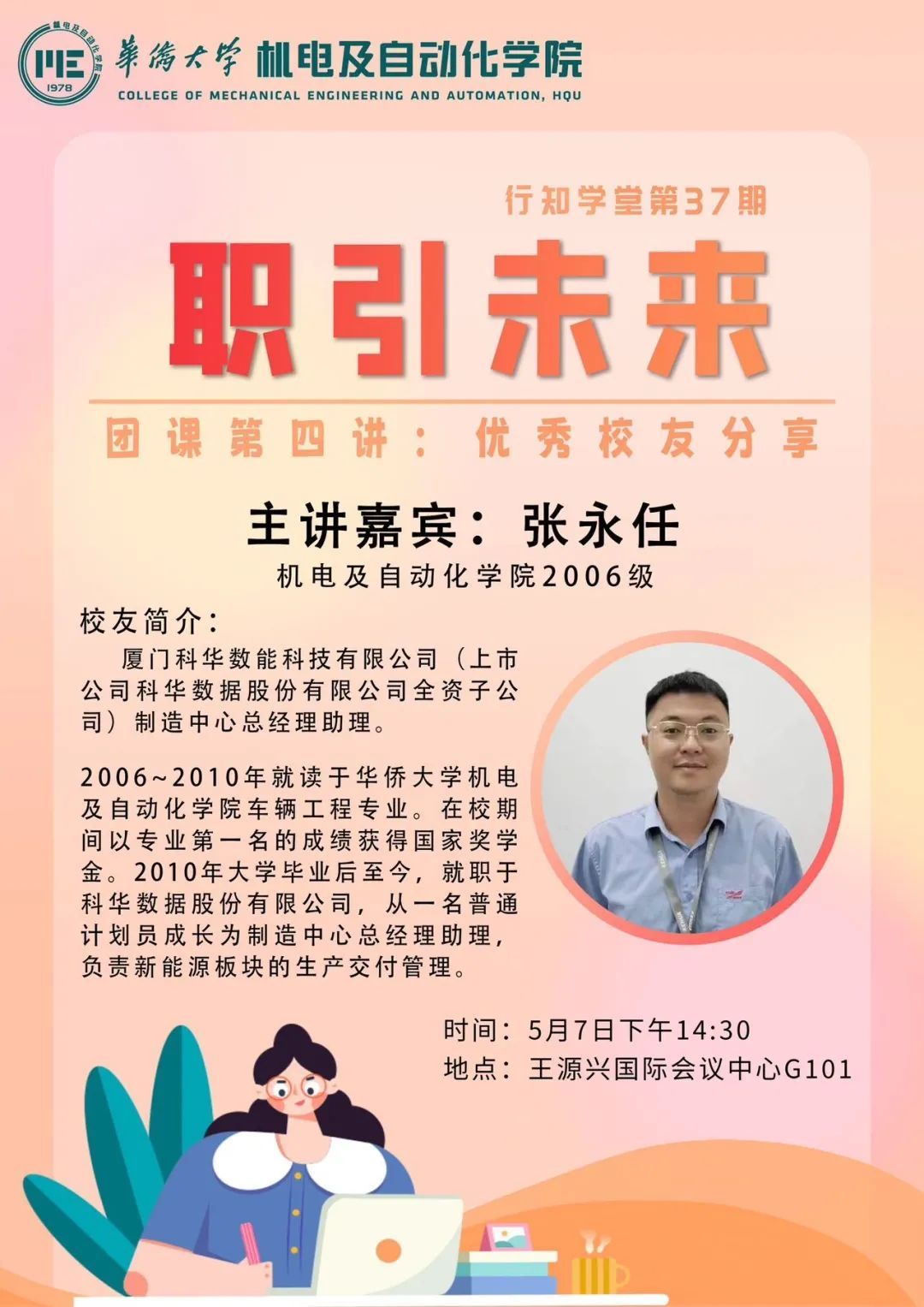 张永仼学长认为毕业后无论是选择考研还是就业都是不错的选择。希望同学们能早早地确定自己的目标,为自己的未来目标提前做出长远规划,在职场中可以拥有空杯心态,干一行爱一行,热爱自己的工作。他希望同学们面对考研或就业等人生选择时,都可以结合自己的专业、兴趣、长处做出合适的选择。