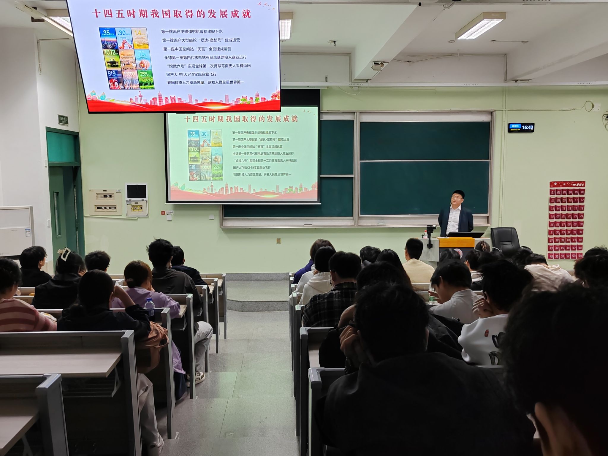 在此基础上,王霏进一步对《建议》的主要内容作了深度解读,并从“三大板块、十五部分、六十一条”的总体结构出发,系统梳理了“十五五”时期的发展目标、基本原则及重点任务,帮助师生准确把握全会精神的主线要义。他强调,“十五五”时期是承前启后、继往开来的重要时期,深入学习贯彻全会精神对于科学把握发展大势、服务国家战略具有重要意义。在分析国内外形势时,王霏结合当前国际竞争格局、科技革命趋势以及我国经济社会发展实际,提出必须深刻认识我国发展面临的战略机遇和风险挑战。“面对复杂严峻的外部环境和经济转型的关键期,我们必须牢牢把握高质量发展这个首要任务,全面深化改革开放,加快构建新发展格局。”