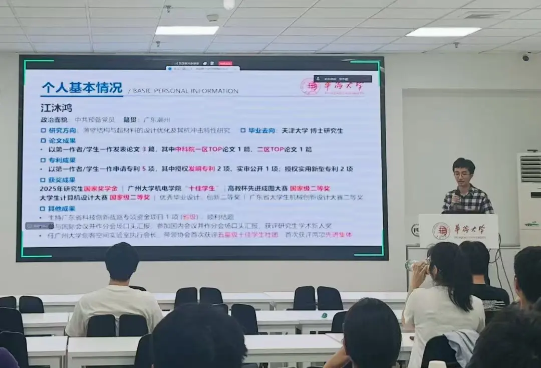 本次分享会邀请了支部两位在学术科研与学科竞赛中表现突出的党员骨干作为分享嘉宾:曾立雄,研究生第三党支部党员,曾担任党支部书记。读研期间,他先后获硕士研究生国家奖学金、校优秀员工等荣誉,以第一作者发表SCI论文2篇,申请发明专利2项,参与多项国家自然科学基金项目。江沐鸿,研究生第三党支部预备党员,本硕阶段以第一作者或员工一作身份发表论文3篇,其中含中国科学院TOP期刊论文2篇,获授权发明专利、实用新型专利各2项,主持广东省科技创新战略专项资金项目并结题,曾获研究生国家奖学金及多项国家级学科竞赛奖项。