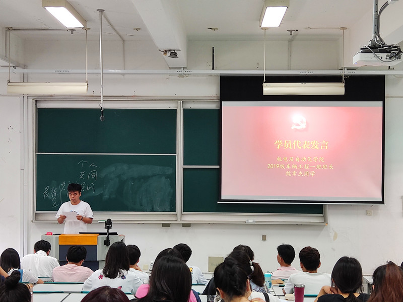 2019级车辆工程一班班长魏幸杰代表本期培训班学员发言,表示会珍惜本次培训班这来之不易的机会,认真学习党的历史和党的先进思想、创新理论,不断完善自我,提高思想认识,争取早日入党。
