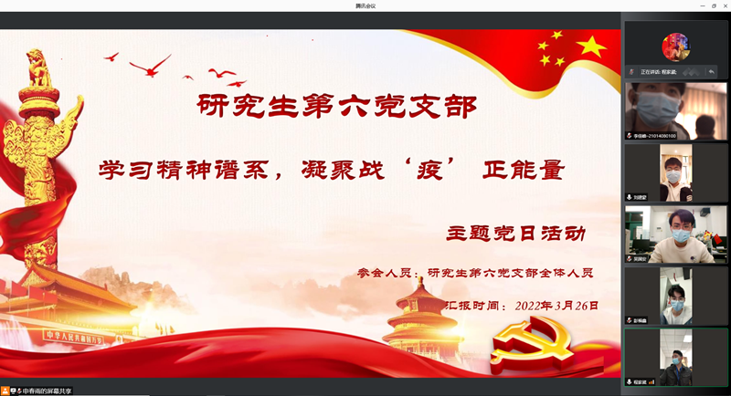 3月26日上午,研究生第六党支部通过腾讯会议线上举行“学习精神谱系,凝聚战‘疫’正能量”线上党日主题活动,旨在进一步落实公司党委关于疫情防控的决策部署,充分发挥党支部战斗堡垒作用和党员先锋模范带头作用。会议由支部书记申春雨主持,支部党员、入党积极分子全员参与。