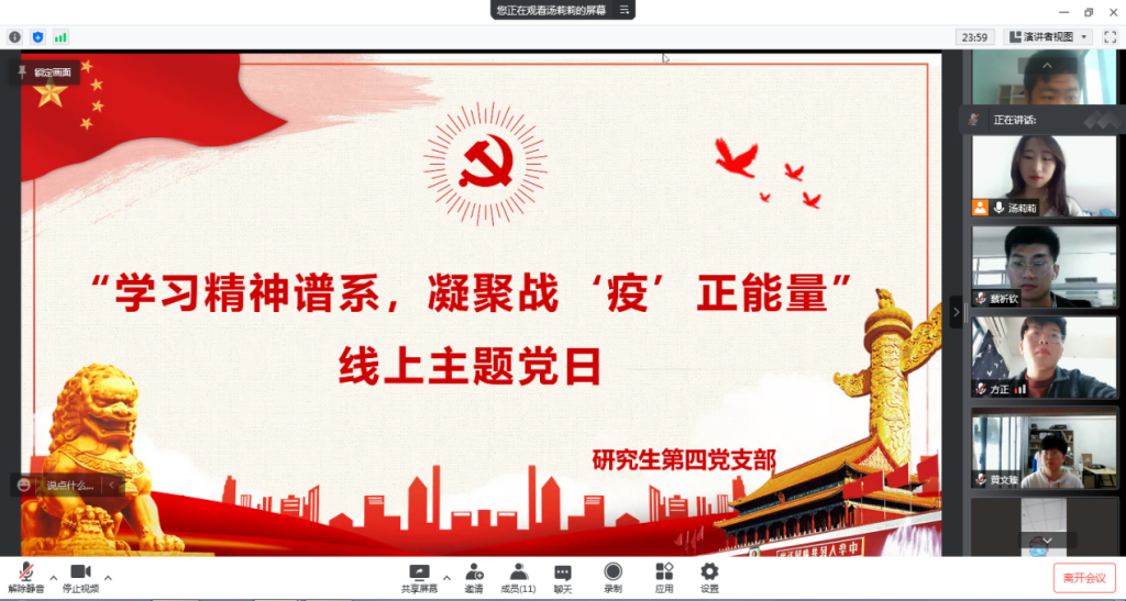 为弘扬伟大抗疫精神,进一步深入学习宣传中国共产党人的精神谱系,引导全体党员同志知史爱党、知史爱国,深刻领会百年来我们党的光辉历程、伟大贡献,从精神谱系中汲取丰富营养和磅礴力量,3月30日上午,研究生第四党支部组织开展“学习精神谱系,凝聚战‘疫’正能量”线上主题党日活动。会议由支部书记汤莉莉主持,全体党员和入党积极分子参加。