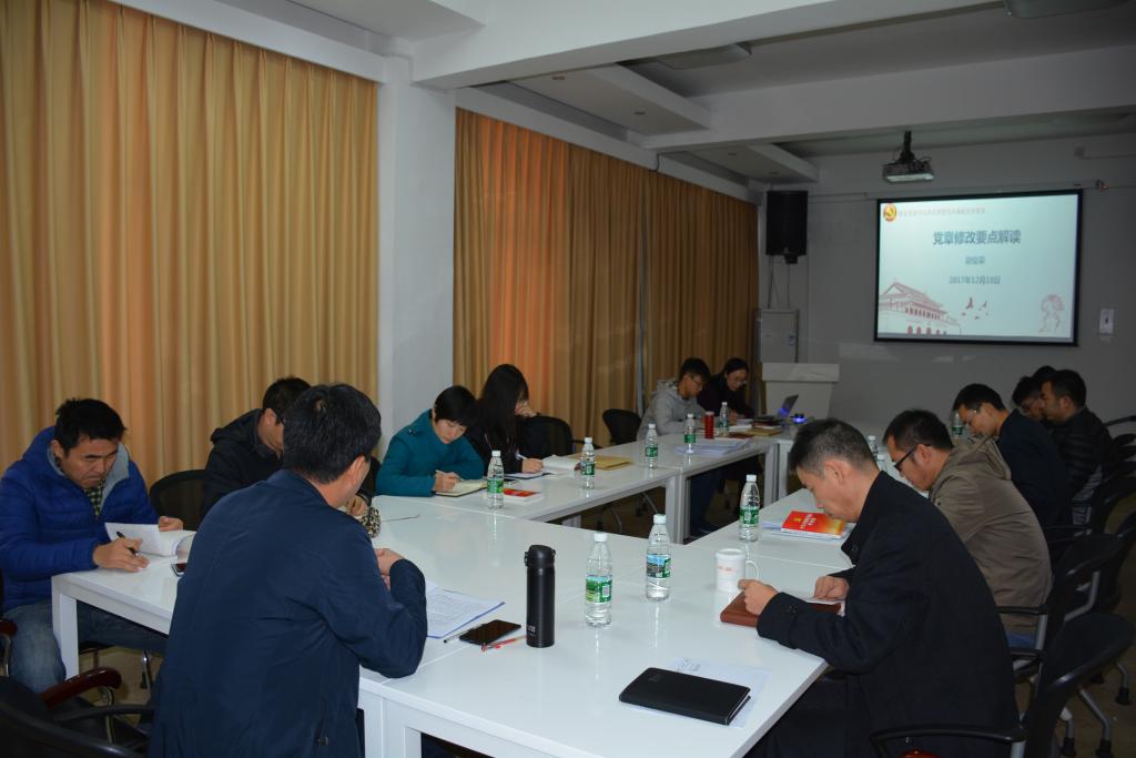 随后,谢俊荣为全体与会人员授课,作题为《党章修改要点解读》的报告,从十三个方面详细解读了党章修改要点。他指出,党章是党的总章程,集中体现了党的性质和宗旨、党的理论和路线方针政策,是全党必须共同遵守的根本行为规范。他要求广大党员要自觉学习党章、遵守党章,自觉加强党性修养,增强政治意识、大局意识、核心意识、看齐意识。授课结束后,与会人员一起学习了《十九大党章修正案学习问答》,并展开交流讨论。