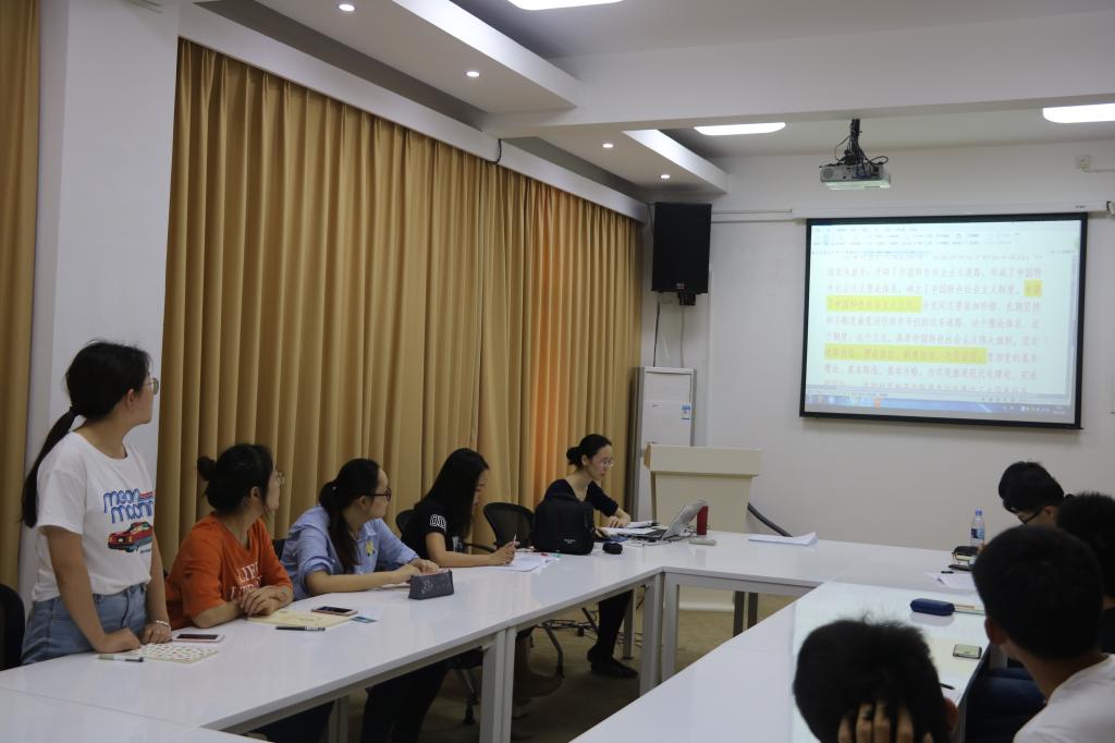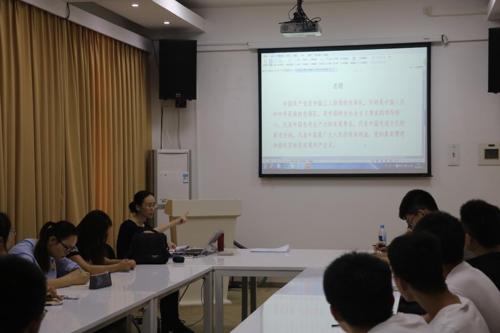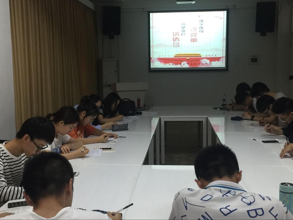 随后,大家以接力的方式诵读党章,采取诵读—分析—讨论的模式,边读老师边讲解,边读边研习讨论,结合自身,结合时事热点谈收获,谈体会。在诵读“党员”一章,谈到党员的标准、义务和权利时,大家还以“拒当洁洁良式双面人”展开讨论,研究生党员王昊谈到:“党章在党员的义务中规定,党员要维护党的团结和统一,对党忠诚老实,言行一致,反对阳奉阴违的两面派行为。洁洁良事件应该引起我们的警醒和反思,作为党员,应该要言行一致,坚守入党初心,不仅在组织上入党,更要一生一世在思想上入党。”