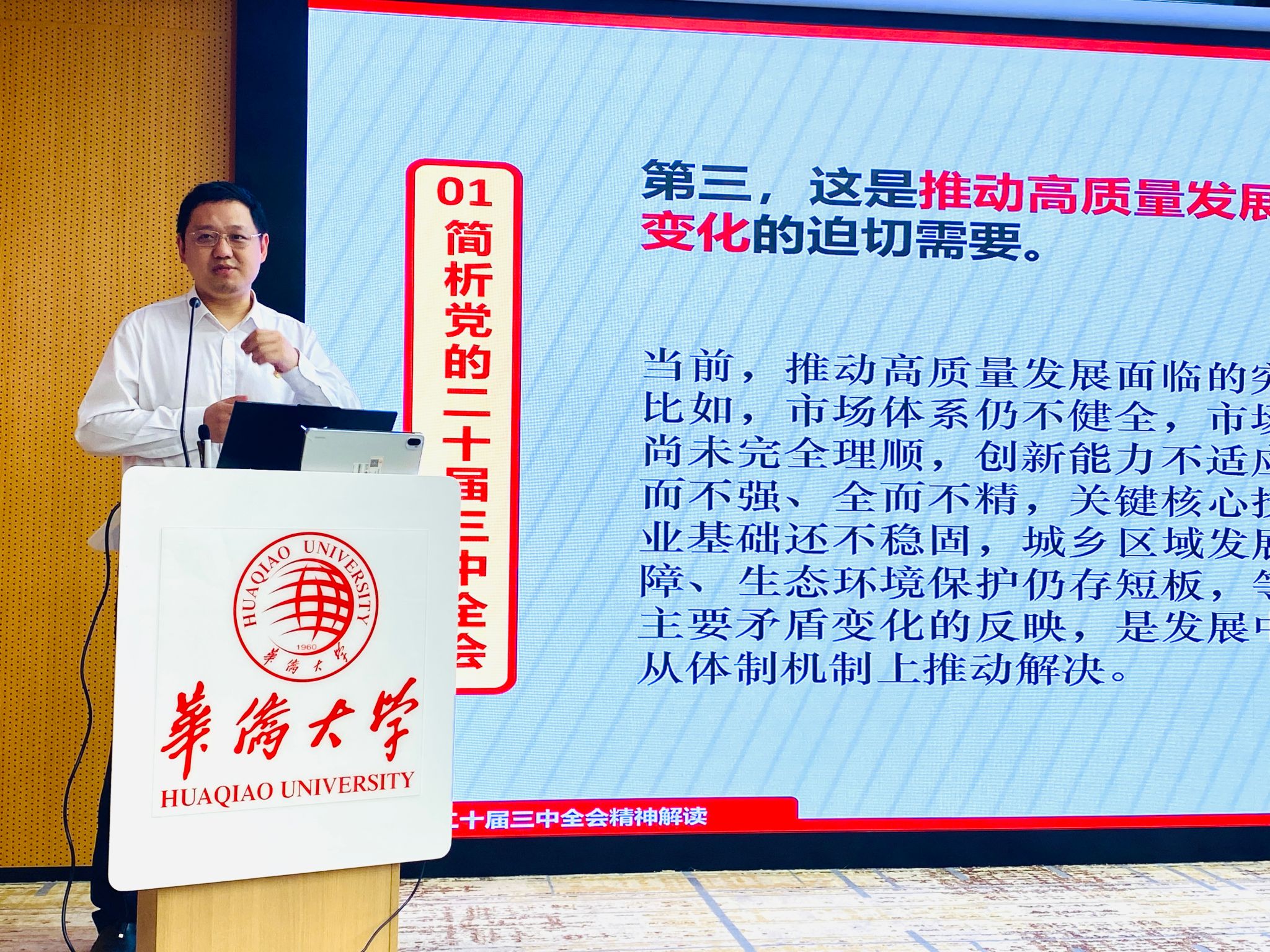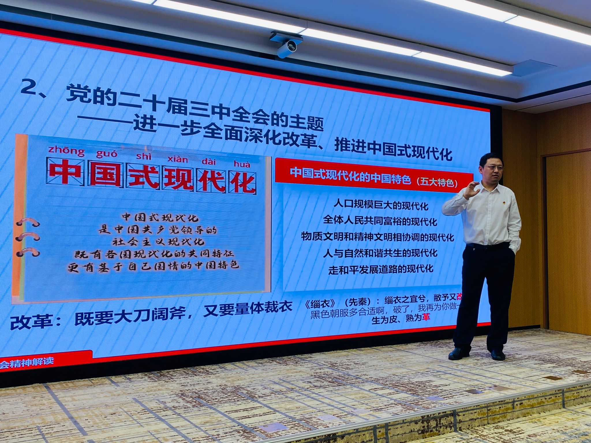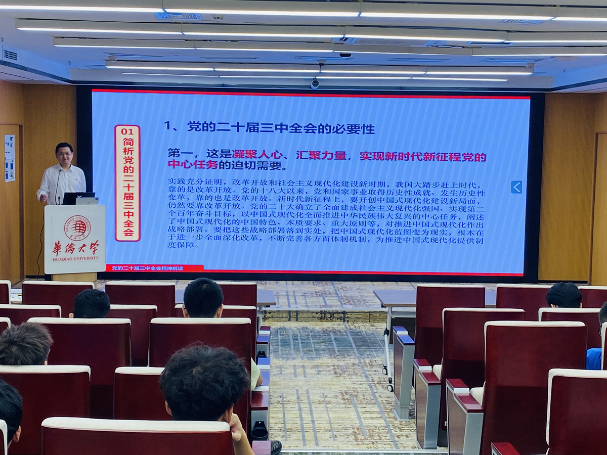 为深入学习贯彻党的二十届三中全会精神,深化全体党员对全会精神理解和把握,11月14日下午,副经理姜峰教授以“党的二十届三中全会精神的一点体会”为题,在综合实验大楼A316报告厅上专题党课,博士研究生第二党支部、研究生第五党支部全体党员与会。