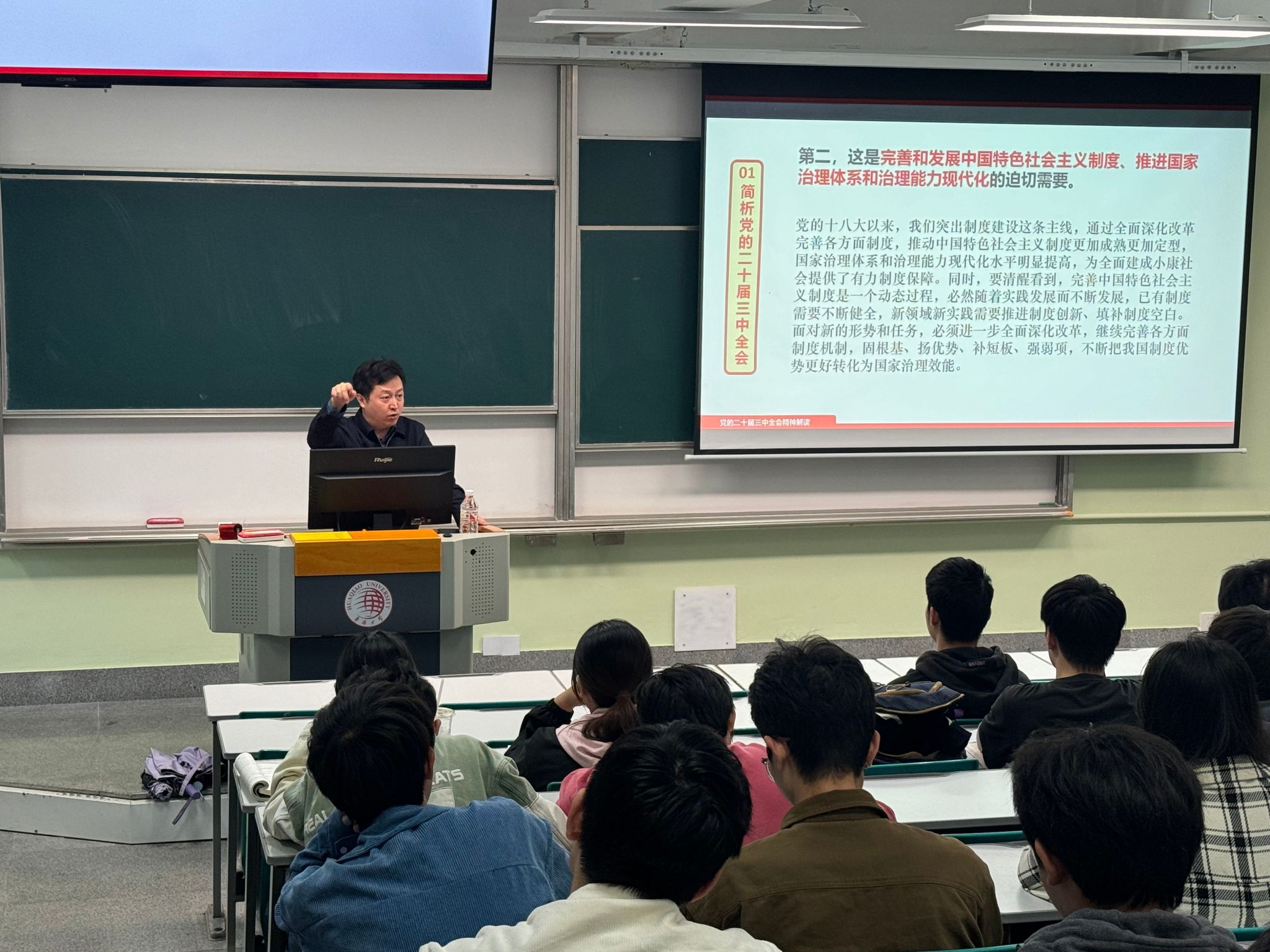 为更好地贯彻落实党的二十届三中全会精神,深化广大党员和入党积极分子对全会精神的理解和把握,12月11日下午,公司党委委员、副经理张勇在综合教学楼群C4-102教室,为本科生第三党支部、研究生第三党支部讲授党的二十届三中全会精神专题党课,逾百名党员和入党积极分子与会。
