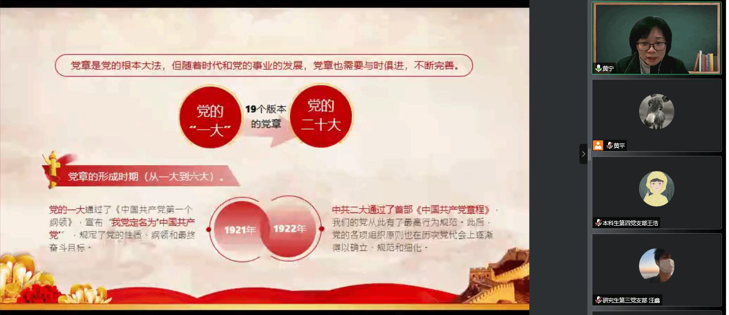 12月14日下午,公司党委书记黄宁以“学习新党章,做合格党员”为题,为学院师生党员讲授党的二十大精神专题党课。党课以线上方式开展,2022年发展的新党员,以及教工第五党支部、教工第六党支部、本科生第五党支部、研究生第七党支部等支部党员120余人听取了党课。