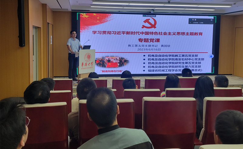 为扎实推进学习贯彻习近平新时代中国特色社会主义思想主题教育,贯彻公司党委师生联学、校地联学的工作部署,6月16日上午,公司党委委员、教工第五党支部书记黄国钦教授在综合实验大楼A316会议室为师生及行业学会党员上主题教育专题党课。教工第五党支部、研究生第五党支部、研究生第六党支部党员与会听取党课,伟德国际1946官网南安石材中心党支部及福建省机械工程学会兼合式党支部党员线上参加。