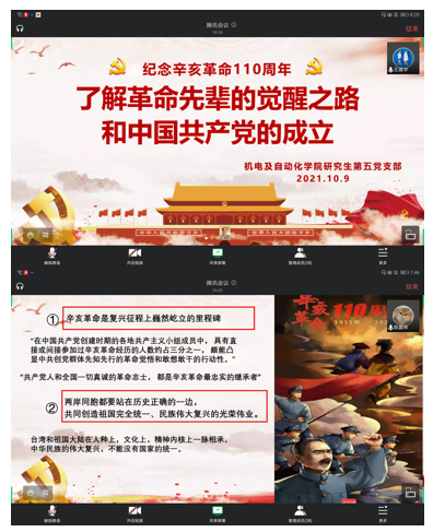 10月9日上午,研究生第五党支部以线上集中收看的形式组织观看了纪念辛亥革命110周年大会实况直播,并专题学习了习近平总书记在大会上的重要讲话。