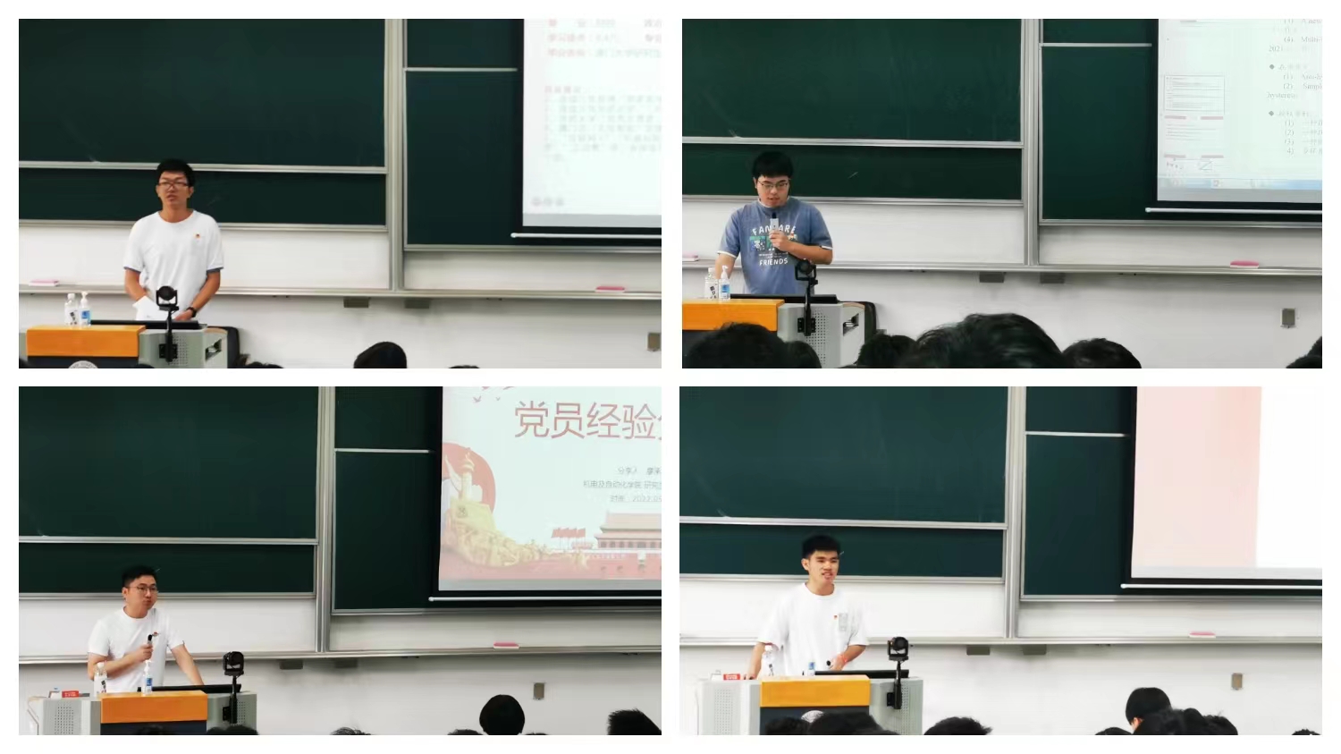 在优秀毕业生党员分享环节,本科生第三党支部组织委员刘权、研究生第二党支部党员傅雨晨、研究生第一党支部预备党员廖承龙、本科生第一党支部副书记叶兴柱分别从学业成绩、科技创新、志愿服务、党建工作等方面作了经验分享。关于提升学业,刘权从自身经历出发,建议大家要制定好计划,勇于尝试,敢于选择,并从多方面论述了学好英语的重要性。傅雨晨以文献阅读、创新思维、时间管理三方面指导与会同志如何在科研科创中取得佳绩,同时希望同志们可以劳逸结合,保持良好心态。廖承龙认为志愿服务是一份责任,也是一份担当,他提议各位同志在服务中奉献自己、展现自己,切实做好党员身份和志愿者身份。作为公司党建办主任,叶兴柱分享了如何平衡好学习与工作的经验,分清主次缓急及不同工作中的角色定位、重视学习与生活的统一是他“鱼和熊掌兼得”的重要原因。