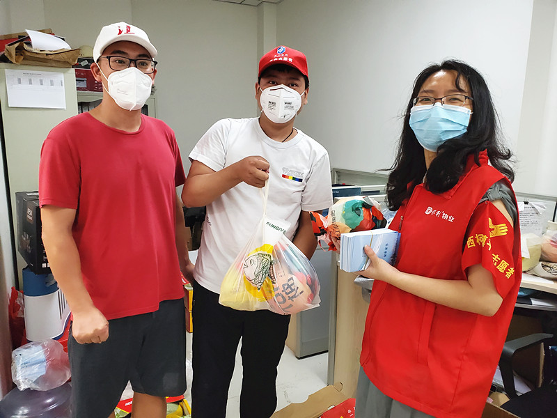 陆文千(左)与其他志愿者一同为居民准备防疫和生活物资