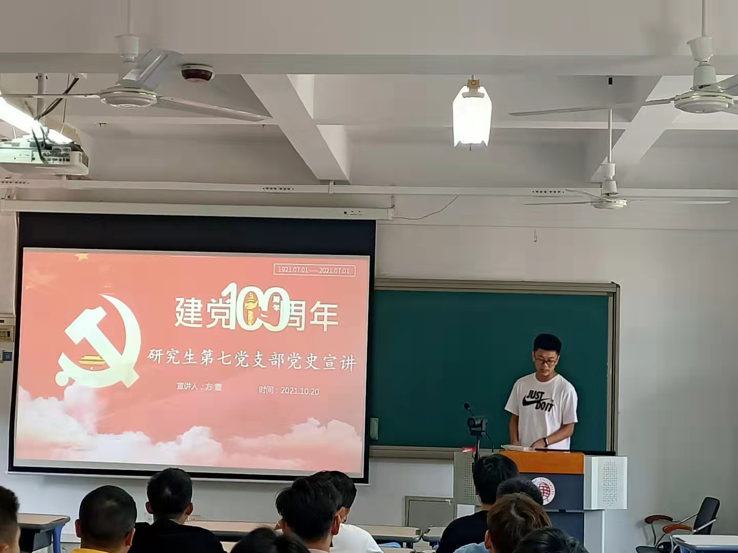 为深入贯彻落实习近平总书记在党史学习教育动员大会上的重要讲话精神,引领广大党员干部群众重温党的光辉历史和伟大成就,10月19日上午,研究生第七党支部在综合教学楼群F2-302教室举行面向2021级智能电液班全体同学的党史宣讲活动,支部宣传委员方震主讲。