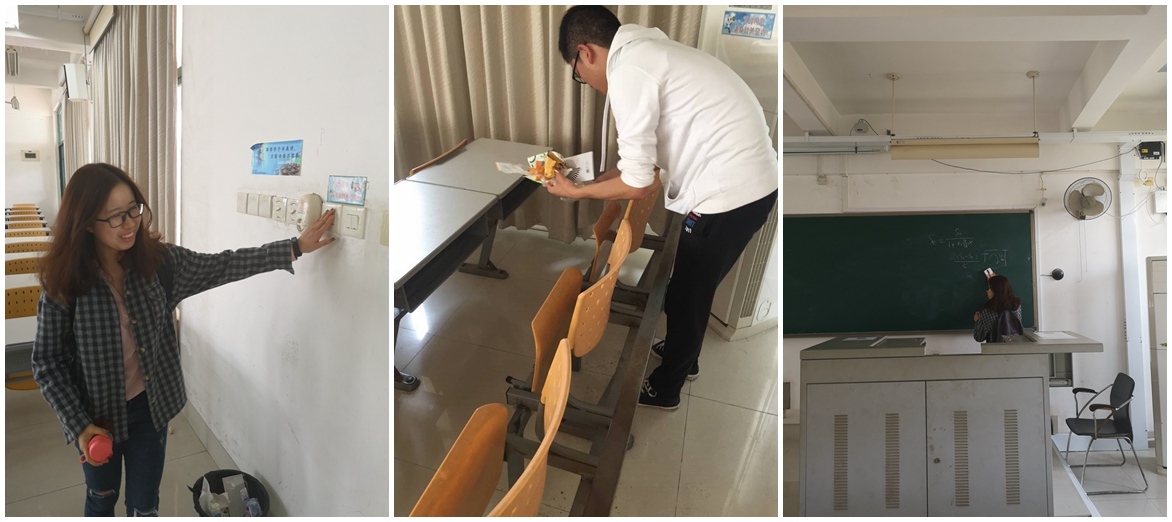 周二的下午,没课,我们常常会在厦门校区教学楼各教室看到穿梭的身影,志愿者们捡走教室里的垃圾,为大家提供干净的学习环境;把教室忘记关闭的灯、多媒体、空调、风扇等随手关闭,以节约用电;把抽屉、讲台、黑板等清扫干净,以备下一次课使用。连续四个星期的实践活动,仿佛雷锋就在我们身边。