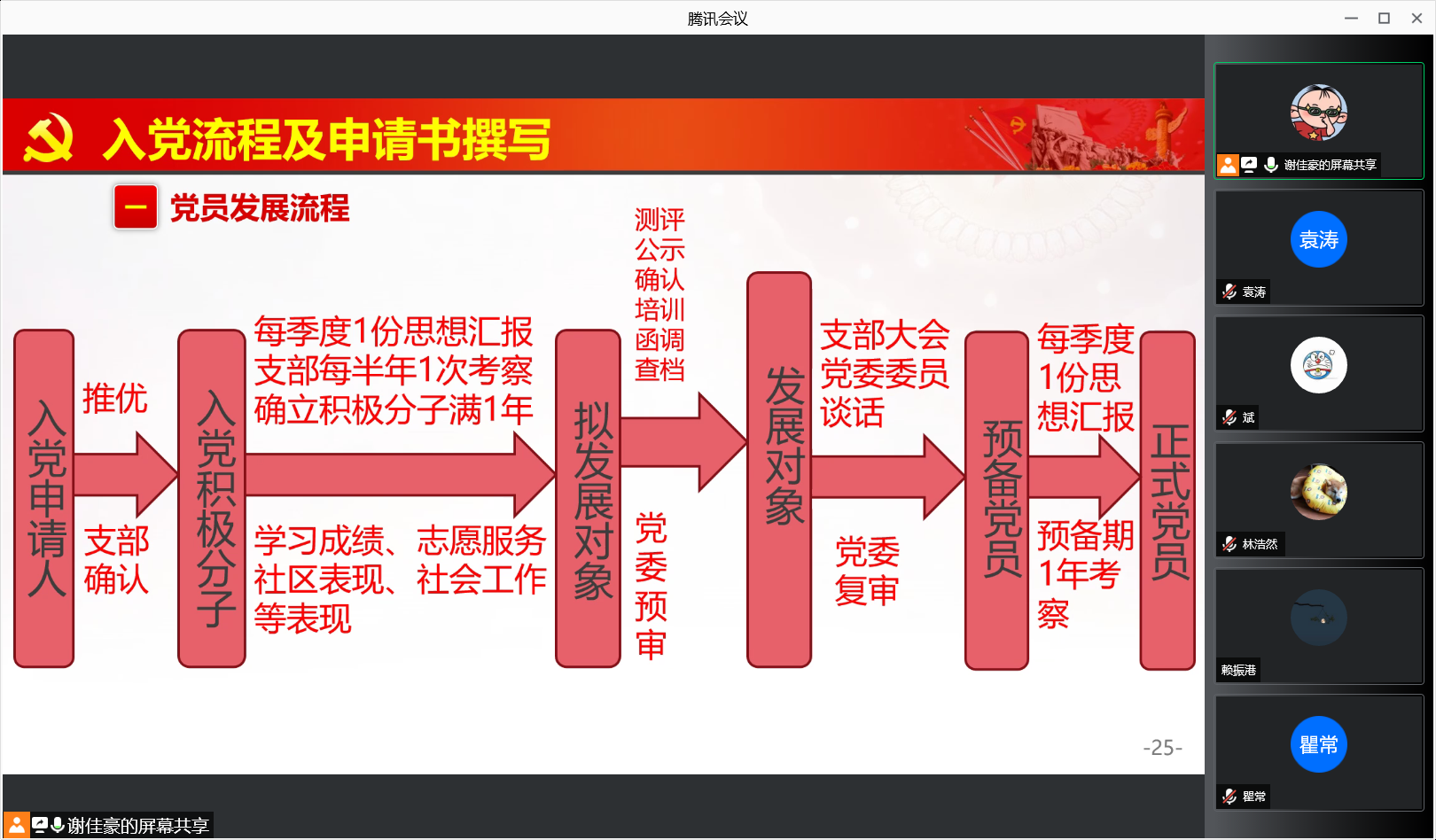 支部宣传委员谢佳豪介绍了中国共产党的性质、最高理想和根本宗旨,以及公司党建概况和研究生第二党支部的组成、活动举办情况等,并就入党流程以及其中需要注意的细节等作了说明。