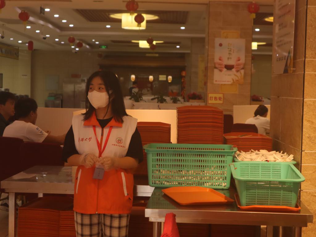 活动当天,志愿者分别在食堂进出口处引导,监督就餐人员规范佩戴口罩,有序测量体温;在食堂内餐具处,志愿者佩戴手套为同学们发放餐具,并在窗口旁督导同学们间隔一米点餐。志愿者同时还主动协助食堂工作人员做好临时性工作。
