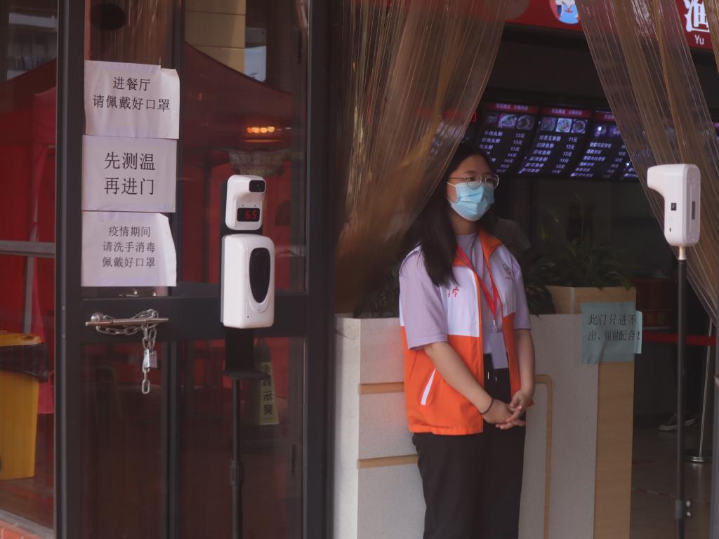 志愿者在餐厅入口处监督测温