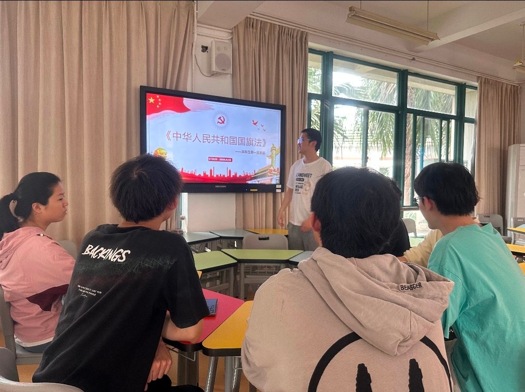 随后在综合教学楼群F2-201教室的学习会上,支部副书记邓茗瀚领学了《中华人民共和国国旗法》的部分内容,并结合实际案例详细讲解了国旗法的基本内容和相关条款。通过学习,全体党员深刻认识到,国旗是一个国家的象征,它代表着国家的尊严和荣誉,每一个人都应该尊重和维护国旗的尊严和权威。