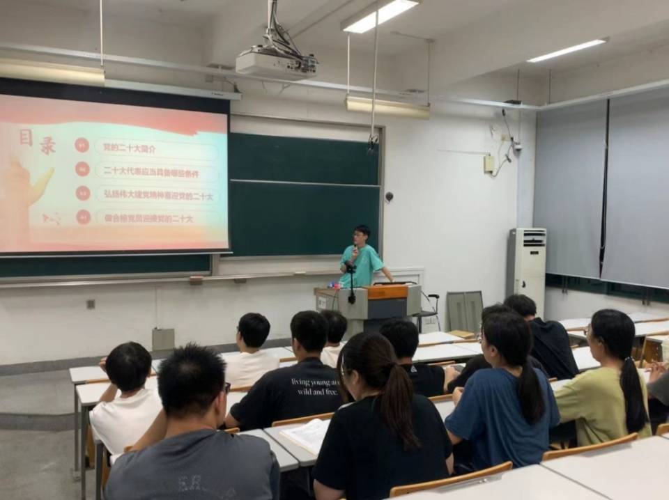 为迎接党的二十大胜利召开,大力弘扬伟大建党精神,巩固拓展党史学习教育成果,9月26日晚,本科生第一党支部在综合教学楼群D5-202教室举行“喜迎党的二十大”主题党日活动。