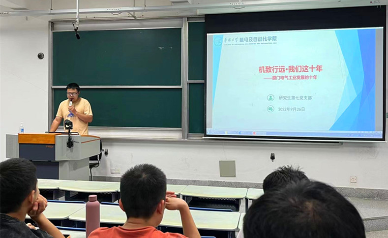 本科生第二党支部预备党员赖志嵩结合暑期调研实践成果走进了2022级机械工程3班开展专题宣讲,“我们将实地调研融入切身感受,以老员工的视角与思维方式为新生们送去更具临场感的党的富民故事,用更接地气的方式来讲述党的故事。”“新生们普遍表示,通过我们结合切身观察、体验和思考的生动讲解和有烟火气的身边故事,让他们对中国共产党有了更具体、真切而深刻的认识,增强了他们早日加入这个光荣而伟大的组织的迫切心情。”赖志嵩表示,作为一名预备党员,为能做一名党的理论的传播者而感到自豪。