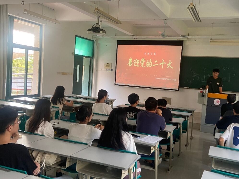 为迎接党的二十大胜利召开,9月28日下午,研究生第二党支部在综合教学楼群C2-202教室开展“喜迎党的二十大”主题党日活动。会议由支部书记邹彤主持,支部全体党员参与。