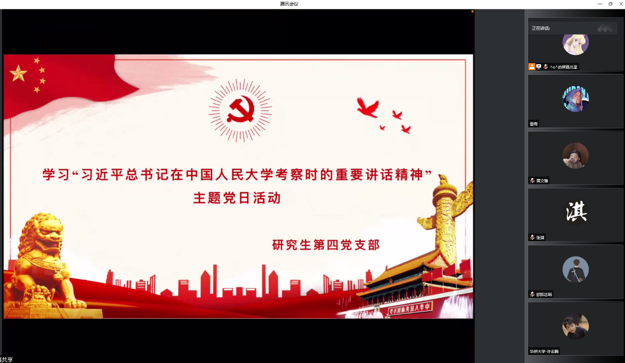 7月6日下午,研究生第四党支部依托腾讯会议系统举行“学习习近平总书记在中国人民大学考察时的重要讲话精神”主题党日活动。活动由支部书记汤莉莉主持,支部全体成员与会。