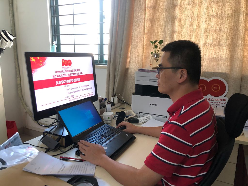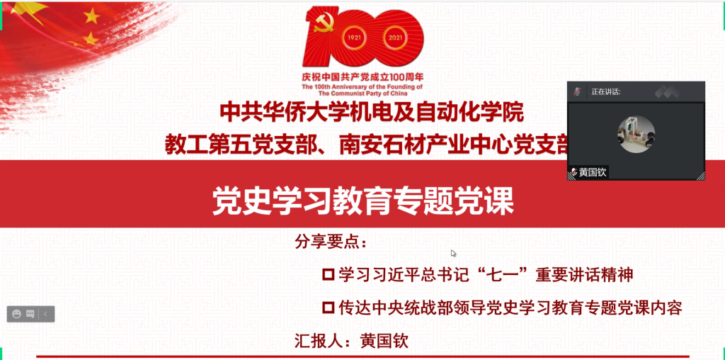 9月28日下午,支部书记黄国钦老师为教工第五党支部、南安石材中心党支部党员上党史学习教育专题党课,解读习近平总书记“七一”重要讲话精神。疫情原因,此次党课在线上举行。