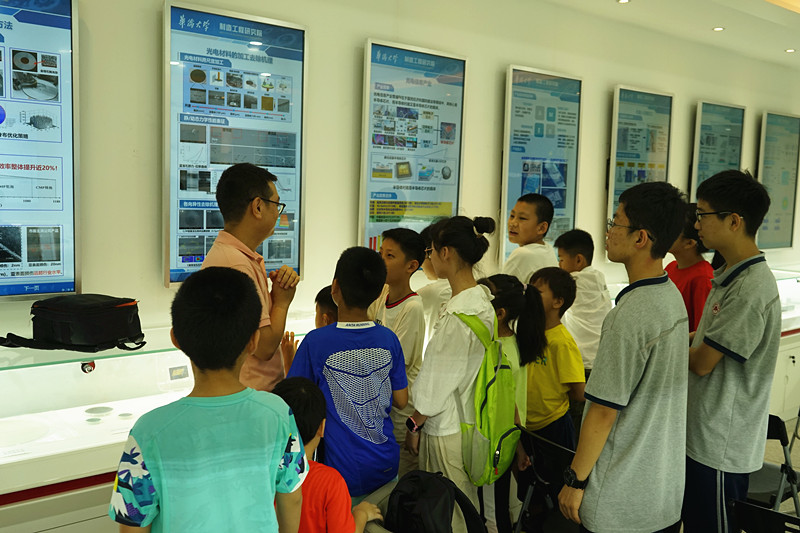 当日上午,支部党员罗求发以“半导体晶圆形貌探索”为主题,通过引导参观展厅及半导体衬底加工检测实验室,让孩子们了解半导体晶圆的用途,感受半导体加工制程中对高精度的要求;观察不同加工状态下的晶圆表面微观形貌异同点,体验不同光滑程度表面的数字化表征,直观地感受半导体衬底加工中的难度。