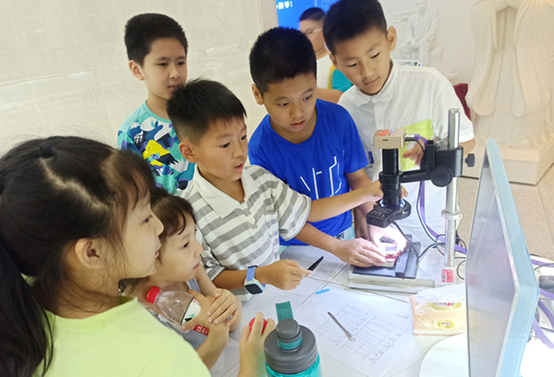 实践环节中,黄国钦引导孩子们近距离观察展厅中的各种超硬磨料工具制品及应用,带领孩子们学习电子显微镜的观察操作方法,指导孩子们进行金刚石磨粒晶形分类、粒径测量及粒度号检索等相关实践操作与体验,让孩子们认识到“指标、测量、标准”在制造业中的重要性。