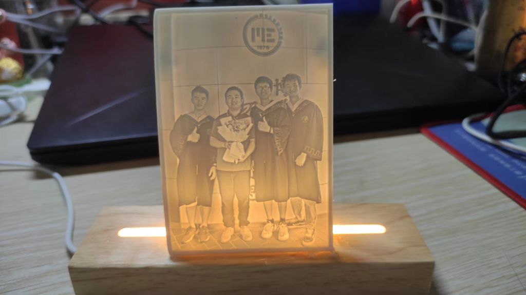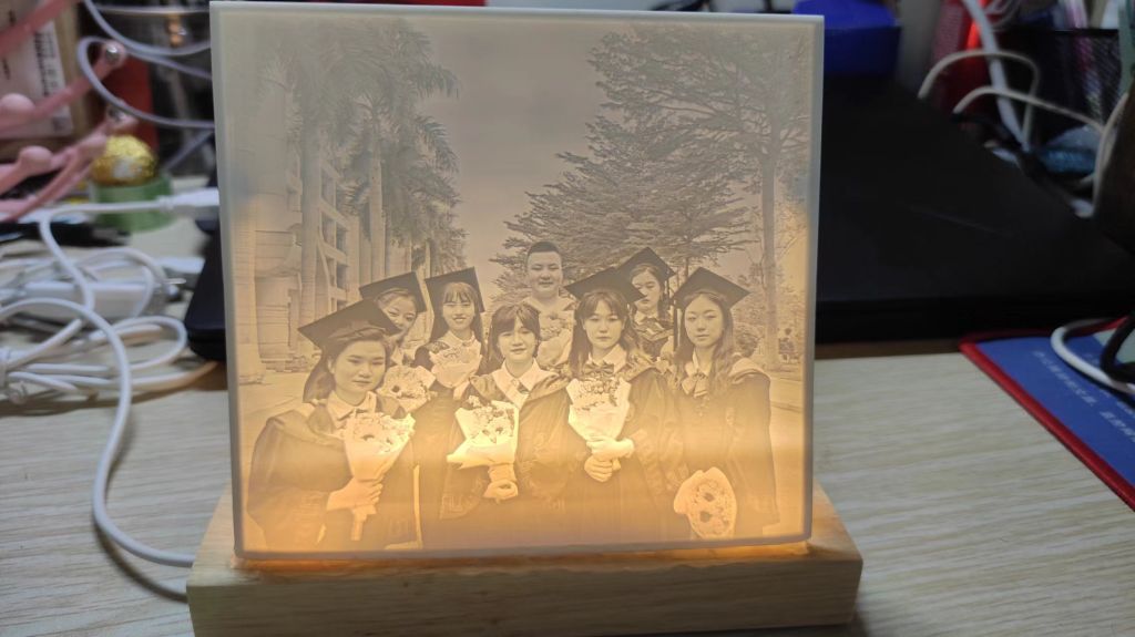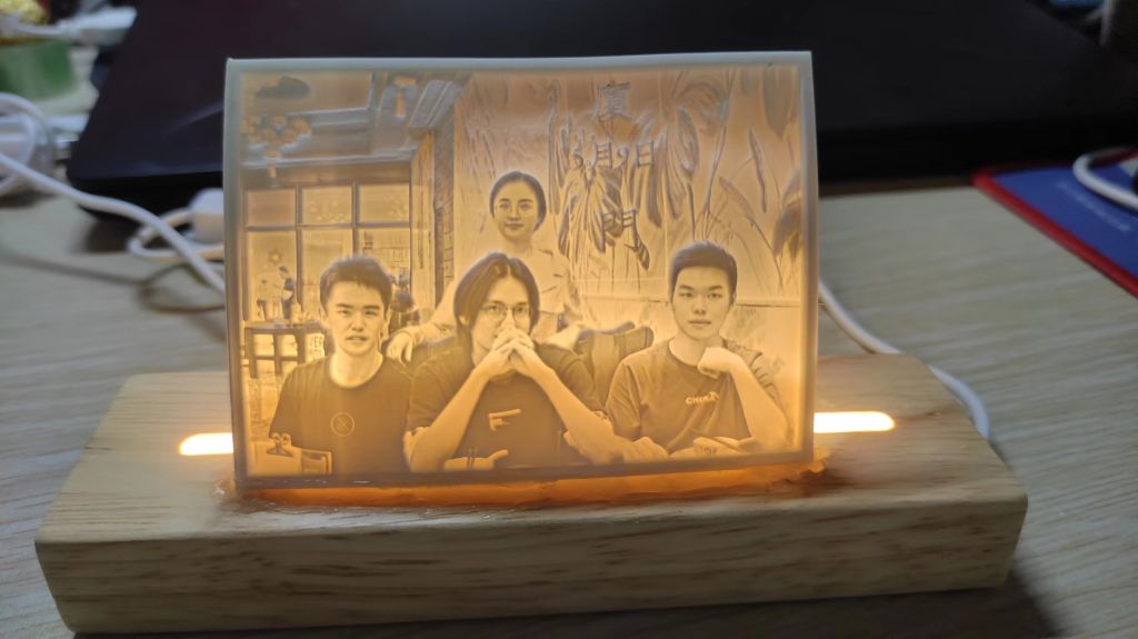 所谓透光浮雕,是在半透明板上打印立体图像,并通过背光效果将其呈现出来。制作这种浮雕需要克服背光照射不均和层纹等技术难题。而这位毕业生的作品不仅展现了他扎实的技术功底,也承载着他对母校和师友们的无限感激与喜爱。每一个浮雕作品上,老师和朋友们的笑脸都栩栩如生,透过层层浮雕,他将自己在华大四年的珍贵回忆深深镌刻其中。回忆起制作过程,这位毕业生在来到3D打印教室时,老师曾问他:“你打印3D浮雕的目的是什么?”他答道:“老师,我想把它打印出来送给我喜欢的老师和朋友,作为毕业纪念!”简短的一句话,流露出他单纯而真挚的情感,令在场的老师为之动容。