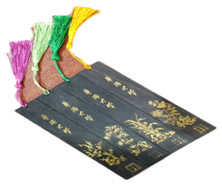 书签制作的步骤如以下:(1)张老师向员工演示了书签表面打抛;(2)向员工讲解书签图画的构建、文字的设计以及软件的操作;(3)讲解书签鎏金的方法,使得书签更精致、美丽;(4)鎏金晾干后,小心翼翼地将多余的色彩打抛掉;(5)以匠人的姿态在书签上钻出流苏穿孔;(6)串上流苏。